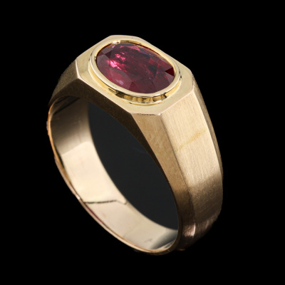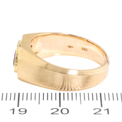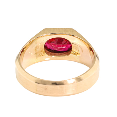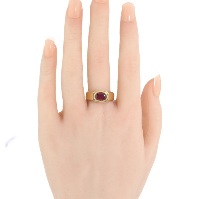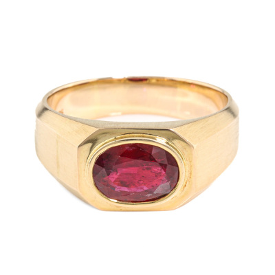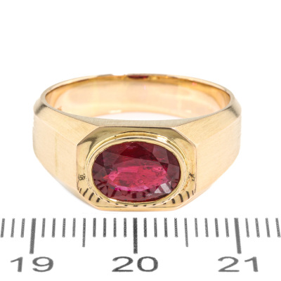 Ruby ring with oval Natural Ruby of approximately 1.90ct. 14ct yellow gold. Ring size Q1/2. Band width: 4.6mm - 6.6mm. Weight: 9.3g. (Pre-owned)