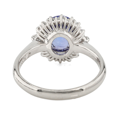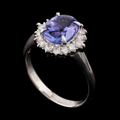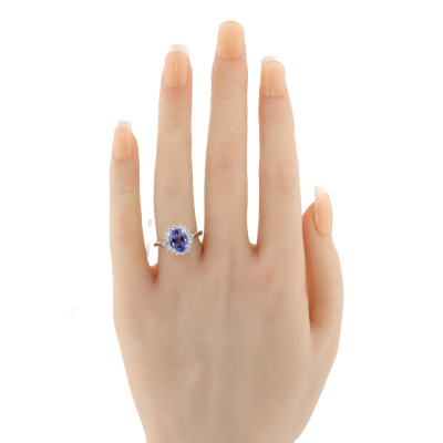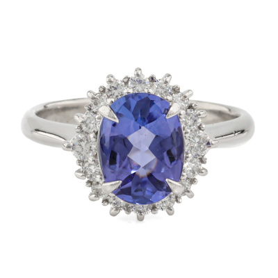 Tanzanite and Diamond ring with oval shape puff top Natural Tanzanite of 1.90ct and round Natural Diamonds totalling 0.39ct (Estimated grading: G VS). Platinum-900. Rings size N. Band width: 2.4mm - 2.2mm. Weight: 6.0g (Pre-owned)