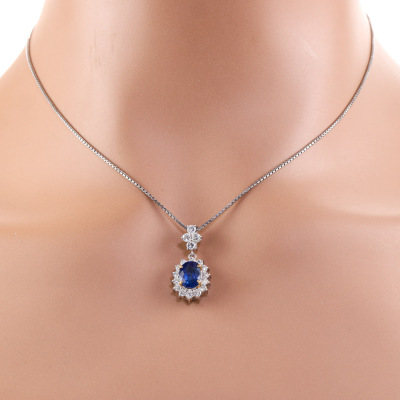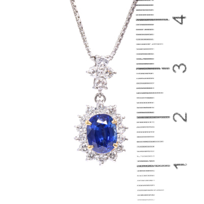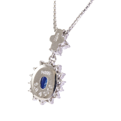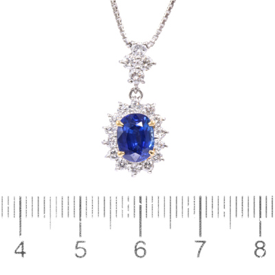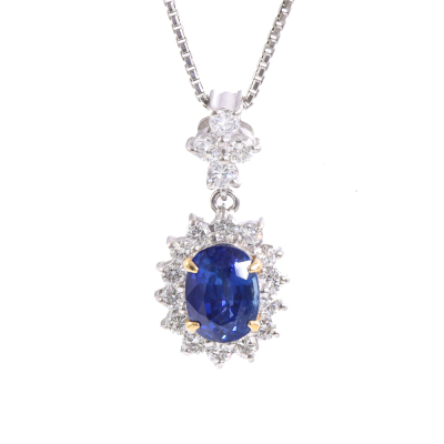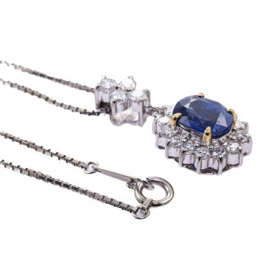 Sapphire and Diamond pendant with an oval shape Natural Blue Sapphire of 1.94ct and round Natural Diamonds totalling 0.70ct (Estimated grading: H SI). Platinum - 900 with 18ct yellow gold claws, with Platinum - 850 adjustable chain. Length: 36cm-40cm. Weight: 7.7g