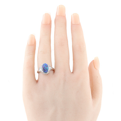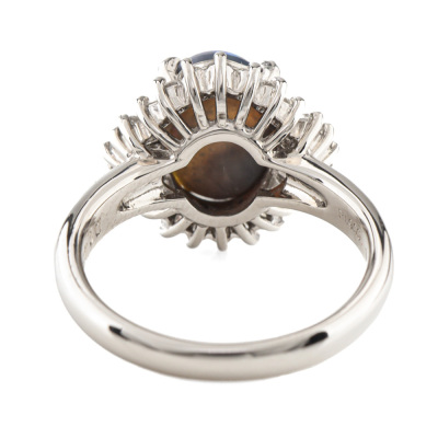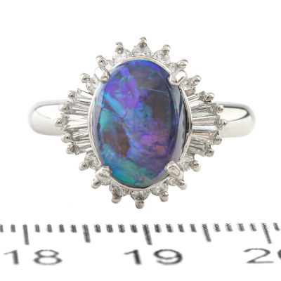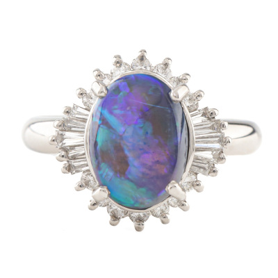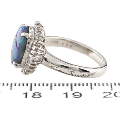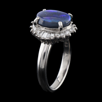 Opal and Diamond ring with oval cabochon cut solid Natural Black Opal of 1.96ct and round & baguette cut Natural Diamonds totalling 0.43ct (Estimated grading: G-H SI). Platinum - 900. Ring size L. Band width: 2.5mm - 3.2mm. Weight: 7.7g. (Pre-owned)