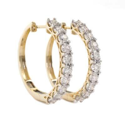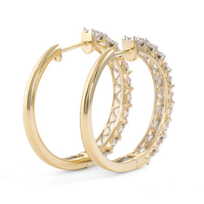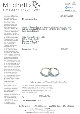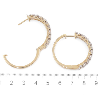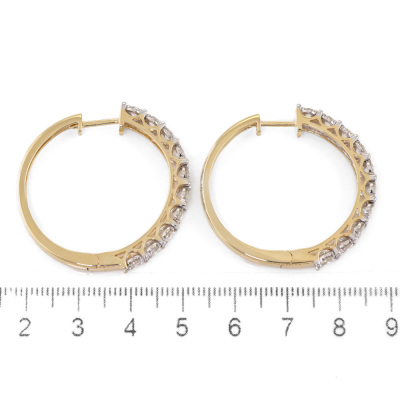 Diamond hoop earrings with 20 round Natural Diamonds totalling 1.98ct (Estimated grading: I-J SI). 14ct yellow gold. Outer diameter: 32mm. Weight: 11.9g. With Certificate #420251. (New).