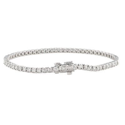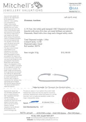 Diamond tennis bracelet with 65 round Natural Diamonds totalling 1.99ct (Estimated grading: I-J SI). 14ct white gold. Length: 19.7cm. Weight: 8.8g. With Valuation Certificate #420436. (New)
