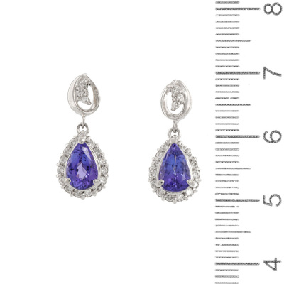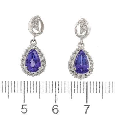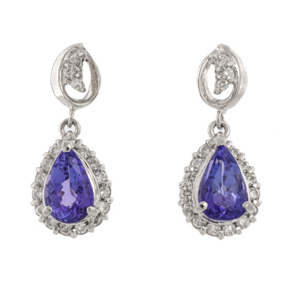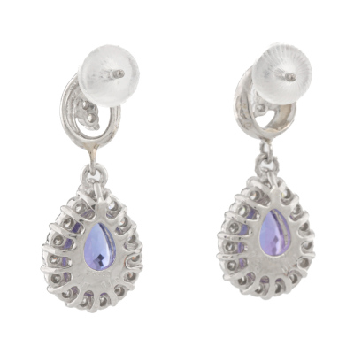 Tanzanite and Diamond earrings with pear shape Natural Tanzanites totalling 1.99ct and round Natural Diamonds totalling 0.36ct (Estimated grading: G-H SI). Platinum - 900 with silicon backs. Weight: 4.7g.