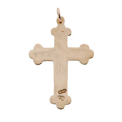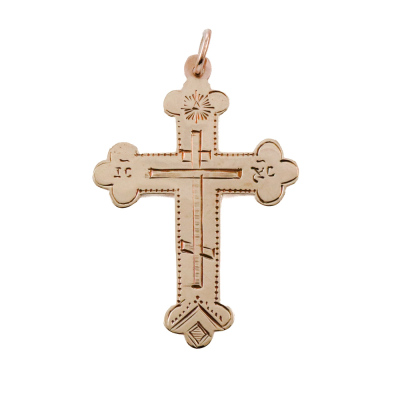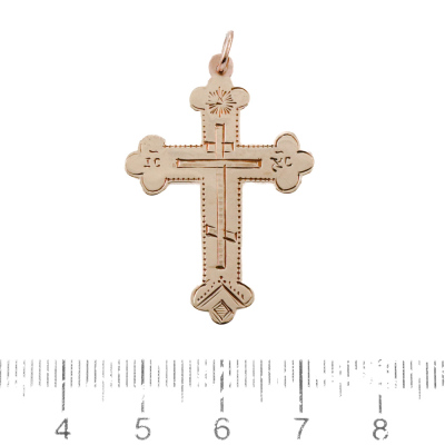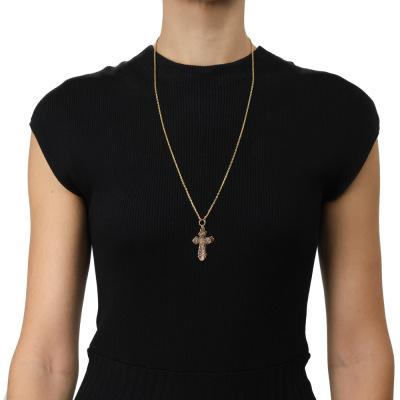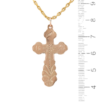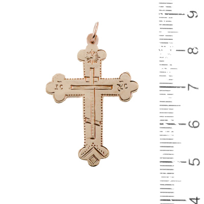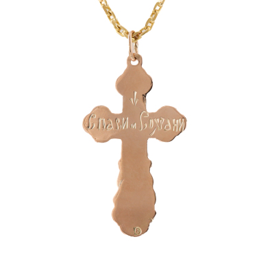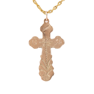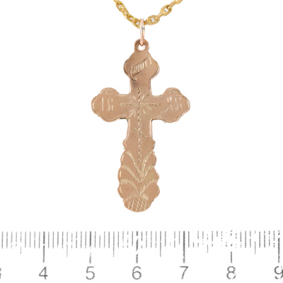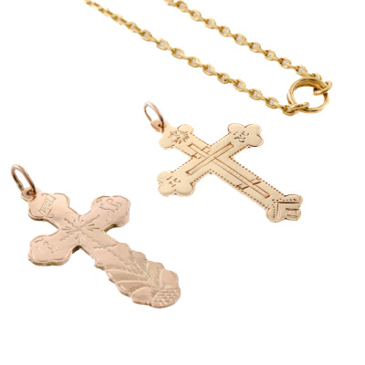 Two cross pendants and one chain set. 1) 14ct rose gold cross pendant. Size: 4.2cm x 2.2cm (including bail). 2) 14ct yellow gold cross pendant. Size: 3.9cm x 2.5cm (including bail). 3) 21ct yellow gold chain with split ring. Length: 70cm. Total weight: 18.3g. (Pre-owned)