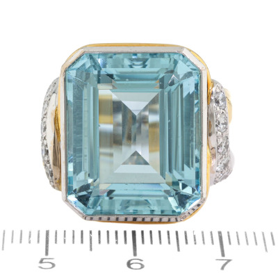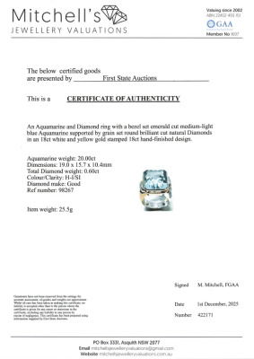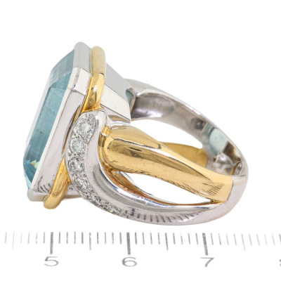 Aquamarine and Diamond ring with centre emerald cut Natural Aquamarine of approximately 20.00ct and 12 round Natural Diamonds totalling approximately 0.60ct (Estimated grading: H-I SI). 18ct yellow & white gold. Ring size P. Band width: 5.6mm-12.5mm. Weight: 25.5g. With Certificate #422171. (Pre-owned)