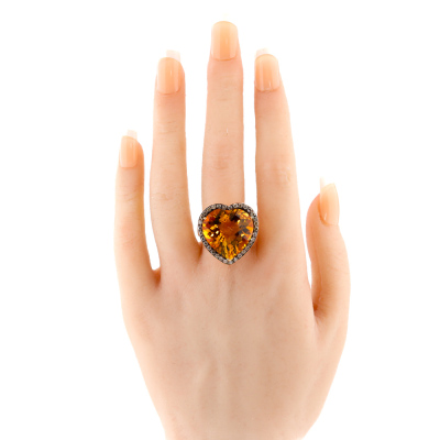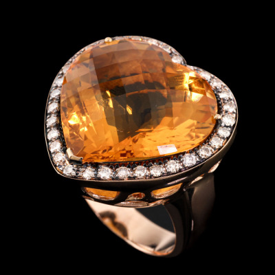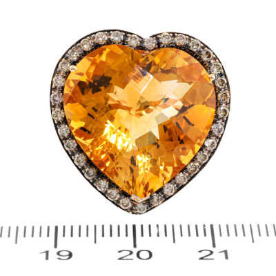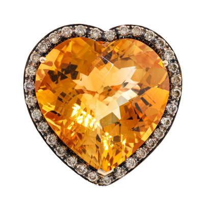Citrine and Diamond ring with heart shape checkerboard cut Natural Citrine of approximately 20.00ct and round Natural Diamonds totalling approximately 0.50ct (Estimated grading: Champagne VS-SI). 18ct rose gold with black rhodium plating. Ring size: N3/4. Weight: 20.9g. (Pre-owned)