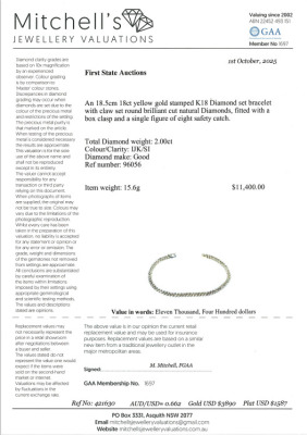 Diamond bracelet with round Natural Diamonds totalling 2.00ct (Estimated grading: IJK SI). 18 yellow gold. Length: 18.5cm. Weight: 15.6g. With Valuation Certificate #421630. (Pre-owned)