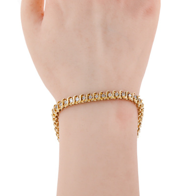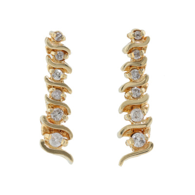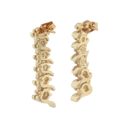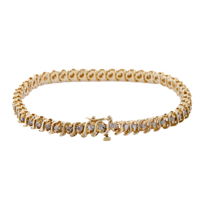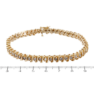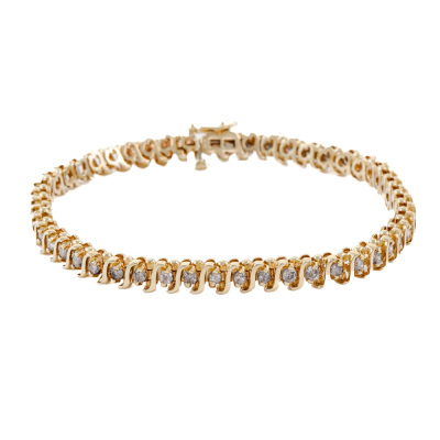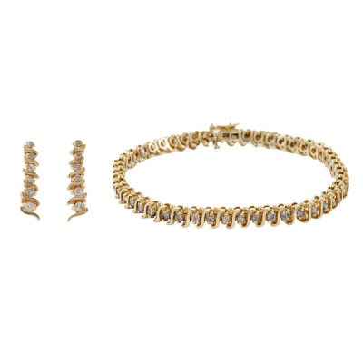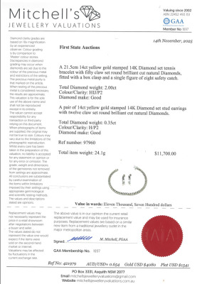 Diamond Tennis Bracelet & Earrings set. 1) Diamond tennis bracelet with 50 round Natural Diamonds totalling 2.00ct (Estimated grading: HIJ P2). Length: 21.5cm. 2) Matching Diamond Earrings with 12 round Natural Diamonds totalling 0.35ct (Estimated grading: H P2). Drop length: 2.2cm. All 14ct yellow gold. Total weight: 24.1g. With Valuation Certificate #421979. (Pre-owned)