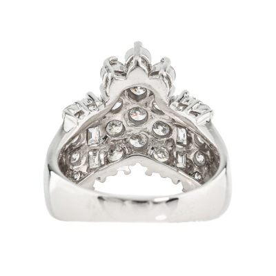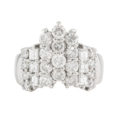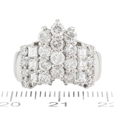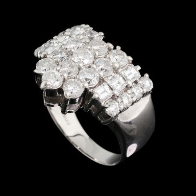 Diamond dress ring with round & carre cut Natural Diamonds totalling 2.00ct (Estimated grading: G-H VS - P1). Platinum - 900. Ring size K3/4. Band width: 2.8mm-6.6mm. Weight: 9.9g. (Pre-owned)