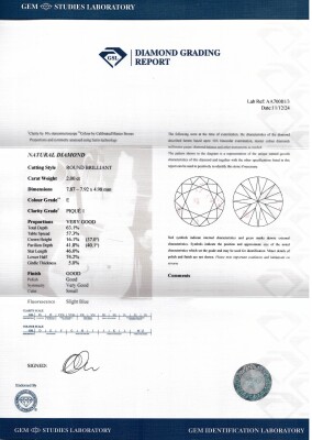 Diamond Solitaire pendant with round brilliant cut Natural Diamond of 2.00ct (with GSL Report graded as E P1 #AA70081/3). 18ct white gold with 18ct white gold 45cm chain. Weight: 4.4g (New)