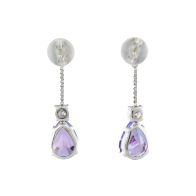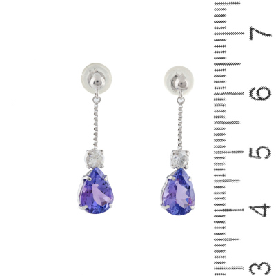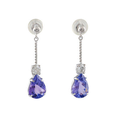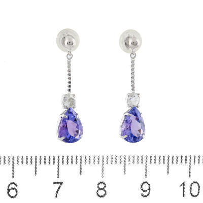 Tanzanite and Diamond earrings with pear shape Natural Tanzanite totalling 2.00ct and round Natural Diamonds totalling 0.20ct. 18ct white gold with 18ct white gold & silicon backs. Weight: 1.2g. (Pre-owned)