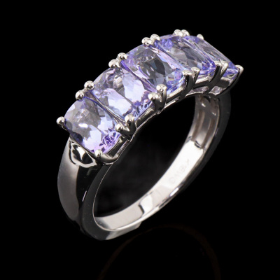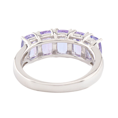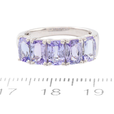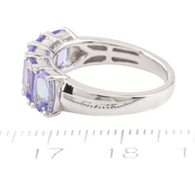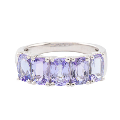 Tanzanite ring with 5 cushion cut Natural Tanzanite totalling 2.00ct. 18ct white gold. Ring size K½. Band width: 2.3mm - 3.8mm. Weight: 5.3g. (Pre-owned)