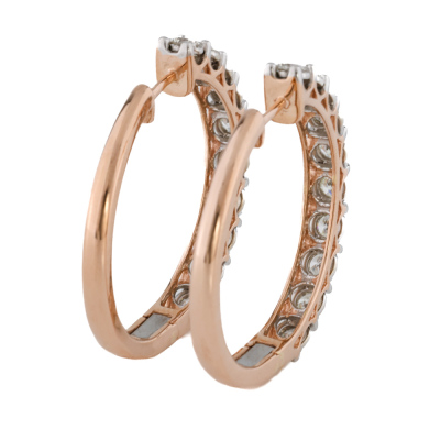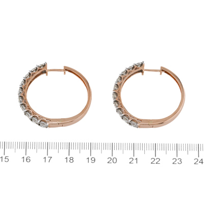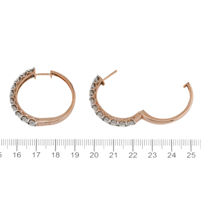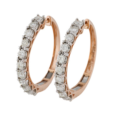 Diamond illusion setting hoop earrings with 10 each round Natural Diamonds totalling 2.01cts (Estimated grading: I-J SI-P1). Diameter: 3.5cm. Width: 4.0mm. 14ct rose gold with white gold claw tips. Weight: 11.6g.