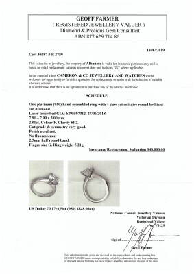 Diamond solitaire ring with centre round brilliant cut Natural Diamond totalling 2.01ct (With GIA Report graded as: F SI2 #6295597312). Platinum-950. Ring size G. Band width: 2.3mm. Weight: 5.2g. With Valuation Certificated dated 18/07/2019. (Pre-owned)