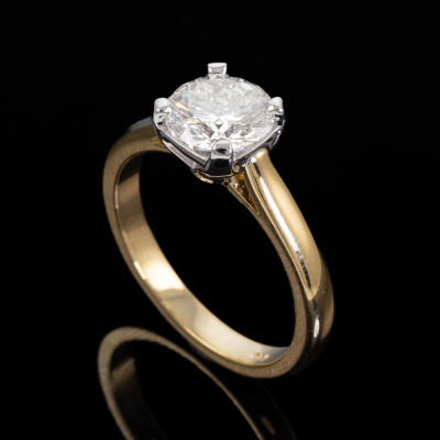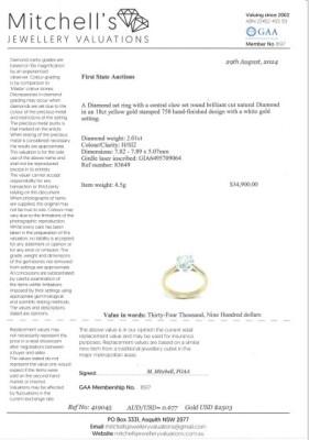 Diamond solitaire ring with round natural brilliant cut Diamond of 2.01ct (With GIA Report graded as H SI2 #6495709064). 18ct yellow and white gold. Ring size K1/2. Band width: 2.5mm. Weight 4.5g. With Valuation Certificate #419045.