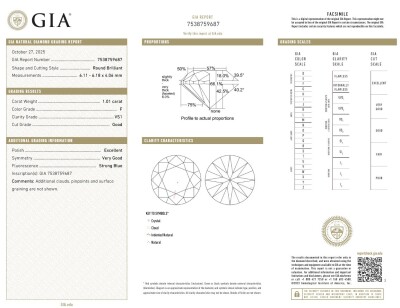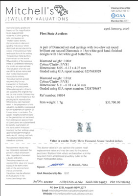 Diamond stud earrings with 2 round brilliant cut Natural Diamonds totalling 2.01ct (with GIA Reports graded as F VS1# 6237683929, 7538759687). 18ct white gold. Weight: 1.7g. With Valuation Certificate #422412. (New)