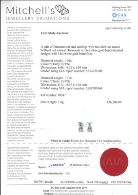 Diamond stud earrings with 2 round brilliant cut Natural Diamonds totalling 2.01ct (with GIA Reports graded as H VS2# 6532620300, 6531705460). 18ct white gold. Weight: 1.6g. With Valuation Certificate #422411. (New)