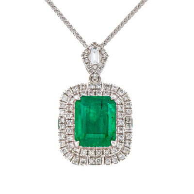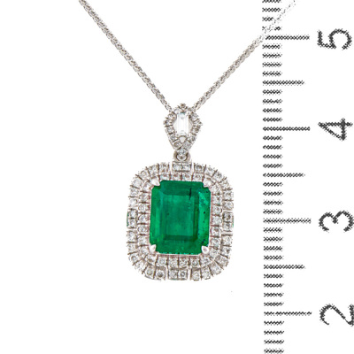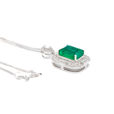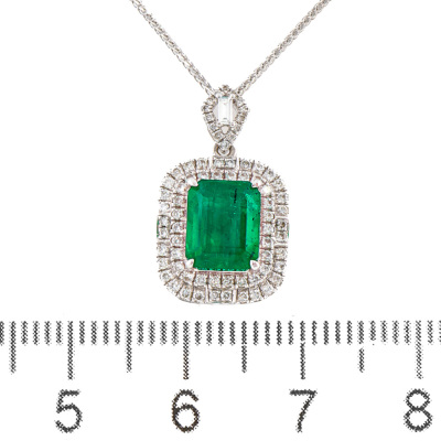 Emerald and Diamond pendant with centre emerald cut Natural Emerald of 2.01ct and round & baguette cut Natural Diamonds totalling 0.31ct (Estimated grading: G-H VS-SI). 18ct white gold with 45cm 18ct white gold chain. Weight: 3.6g. (Pre-owned)