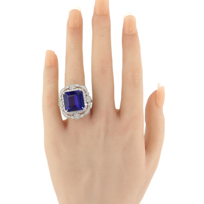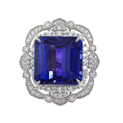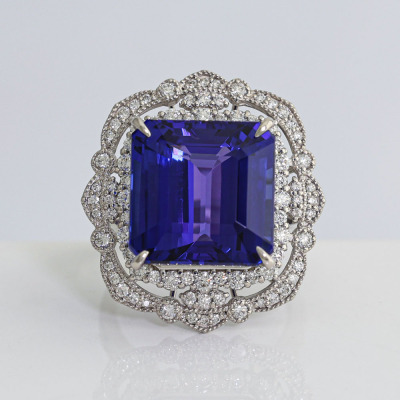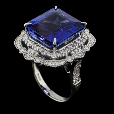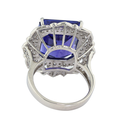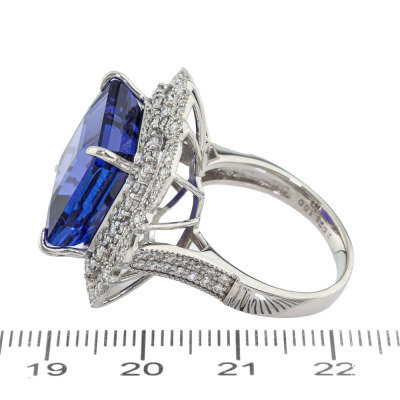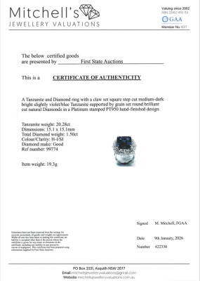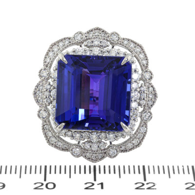 Tanzanite and Diamond ring with square step cut Natural Tanzanite of 20.28ct and round Natural Diamonds totalling 1.50ct (Estimated grading: H-I SI). Platinum-950. Ring size R 1/4. Band width: 3.2mm - 3.8mm. Weight: 19.3g. With Certificate #422336. (Pre-owned)