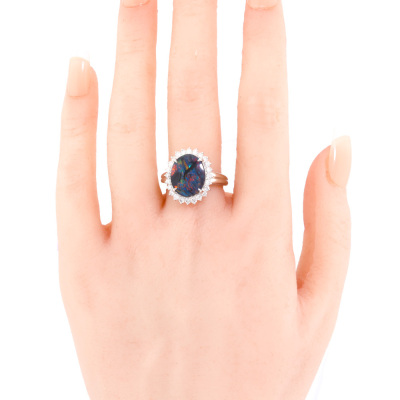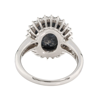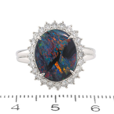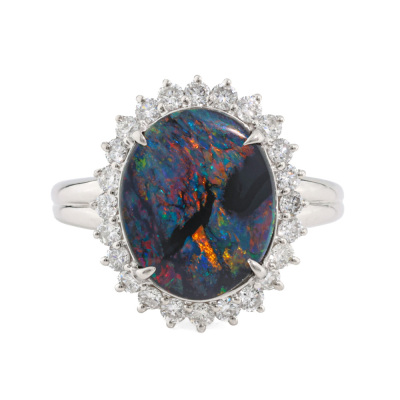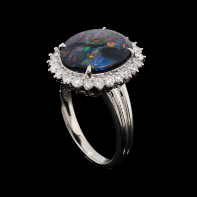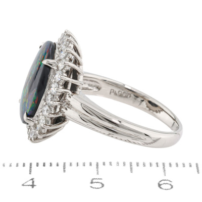 Opal and Diamond ring with oval cabochon cut solid Natural Black Opal 2.02ct and round Natural Diamonds totalling 0.70ct (Estimated grading: G-H SI). Platinum - 900. Ring size O1/4. Band width: 2.1mm - 3.6mm. Weight: 9.6g. (Pre-owned)