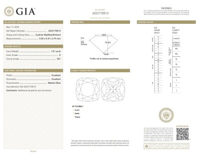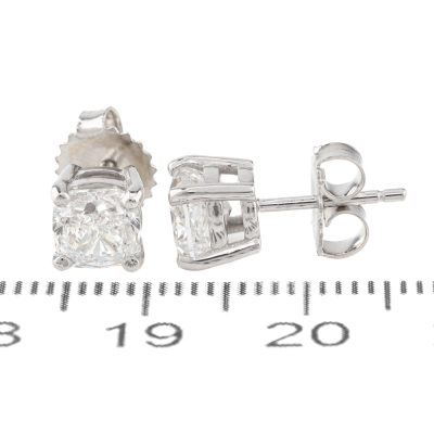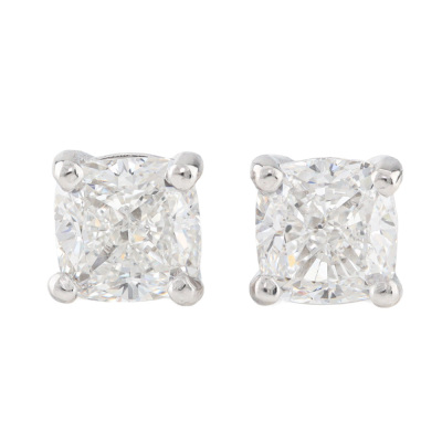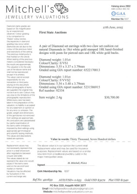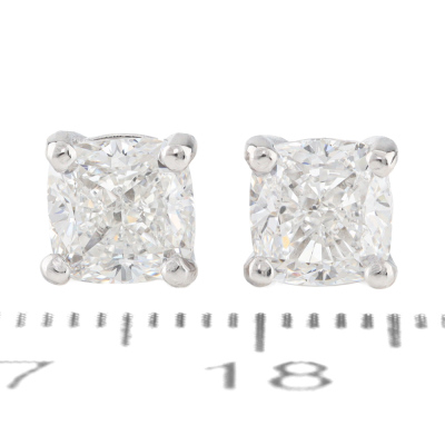Diamond stud earrings with 2 cushion cut Natural Diamonds totalling 2.02ct (with GIA Reports graded as F VVS2 #5231586915 & E VS1 #6522170013). 18ct white gold. Weight: 2.4g. With Valuation Certificate #420859. (New)