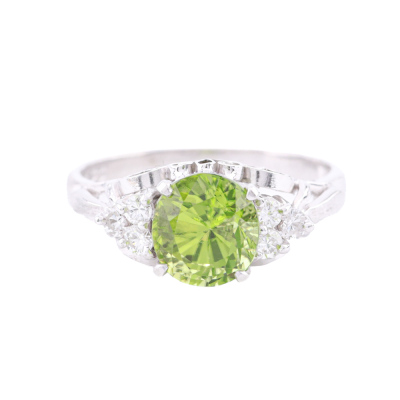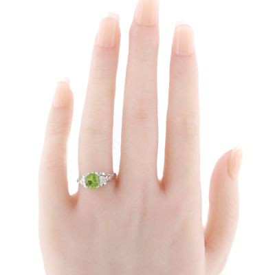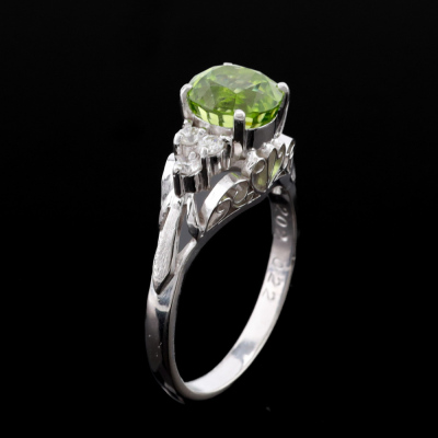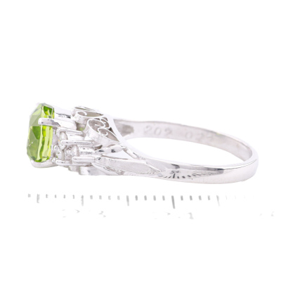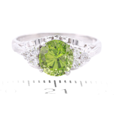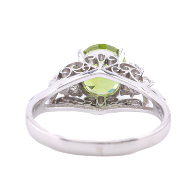Peridot and Diamond ring with oval shape Natural Peridot of 2.02ct and round Natural Diamonds totalling 0.22ct. Platinum - 900. Ring size L. Band width: 2.1mm - 2.3mm. Weight: 4.5g. (Pre-owned)