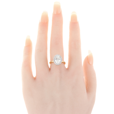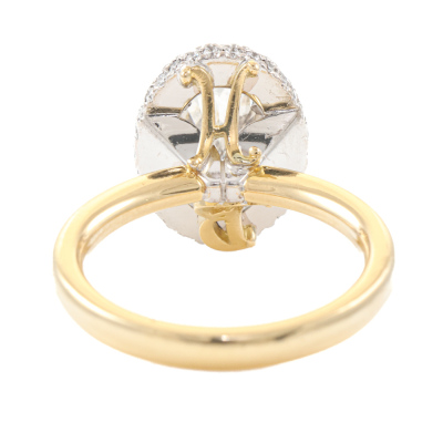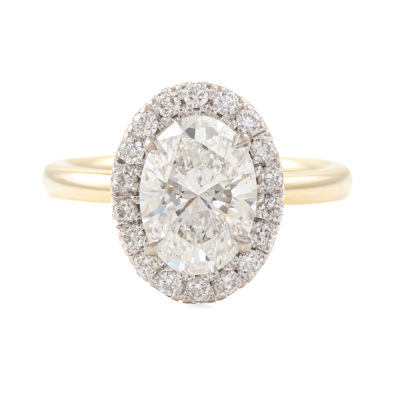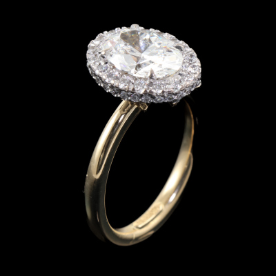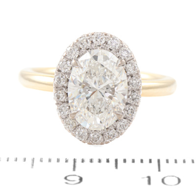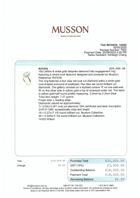 Musson Diamond halo ring with centre oval shape Natural Diamond of 2.03ct (with copy of GIA Diamond Report graded as G SI1 #2181311380) and remaining round Natural Diamonds totalling 0.49ct (Estimated grading: F VS). 18ct yellow and white gold. Ring size K. Band width: 2.5mm-2.2mm. Weight: 7.2g. With copy of Musson Tax Invoice dated 02/05/2020. With Musson box. (Pre-owned)