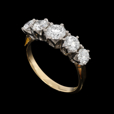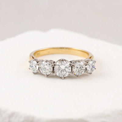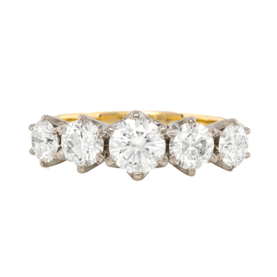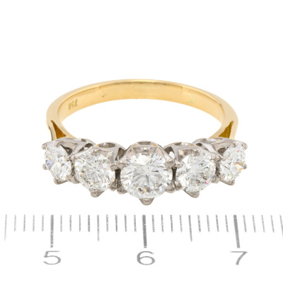 Diamond eternity ring with 5 round brilliant cut Natural Diamonds totalling approximately 2.04ct (Estimated grading: I-J VS). 18ct yellow & white gold. Ring size R. Band width: 2.4mm - 2.6mm. Weight: 5.3g. With copy of Valuation #16.