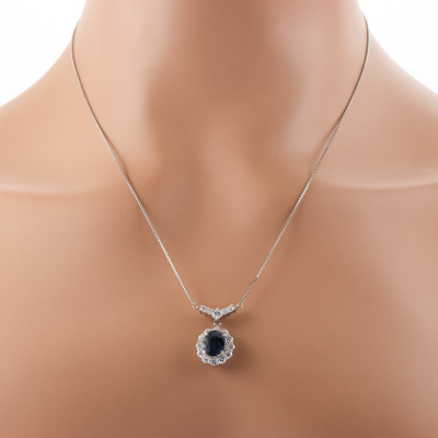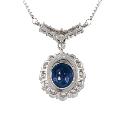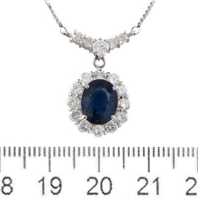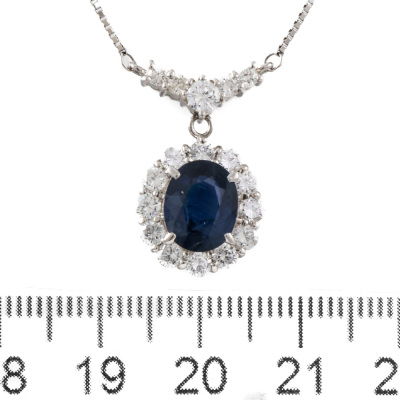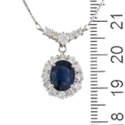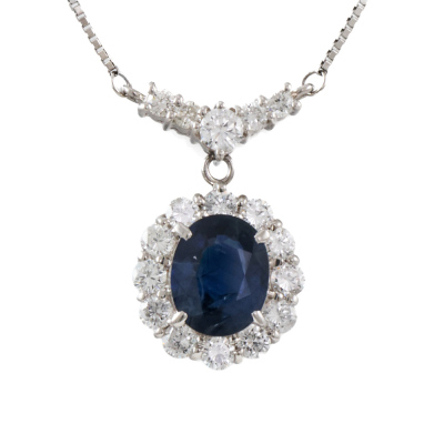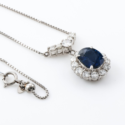 Sapphire and Diamond pendant with oval shape Natural Blue Sapphire of 2.05ct and round Natural Diamonds totalling 1.10ct (Estimated grading: H-I P1). Platinum - 900 with 47cm Platinum - 850 adjustable attached chain. Weight: 7.1g. (Pre-owned)