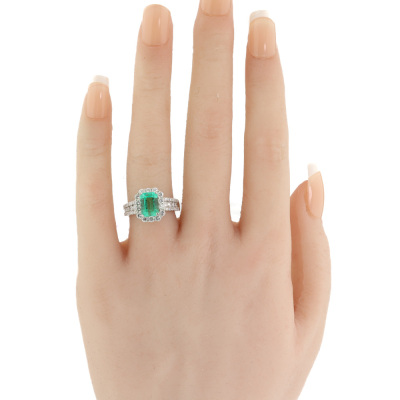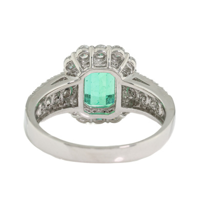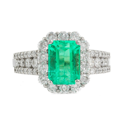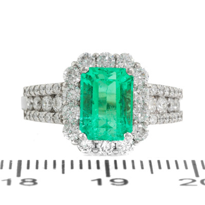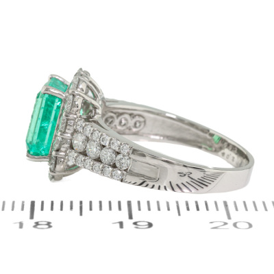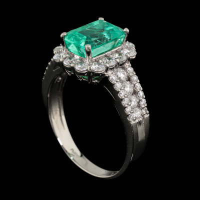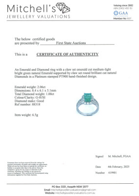 Emerald and Diamond ring with emerald cut Natural Emeralds of 2.06ct and round Natural Diamonds totalling 1.00ct (Estimated grading: G-H SI). Platinum-900. Ring size M. Band width: 4.0mm - 2.3mm. Weight: 6.5g. With Certificate #419901. (Pre-owned)