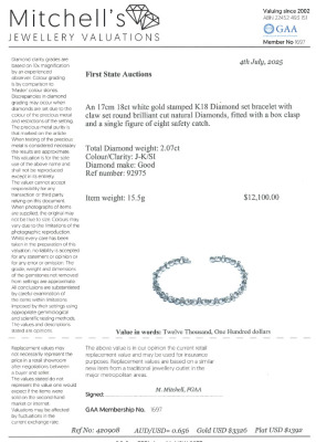 Diamond bracelet with round Natural Diamonds totalling 2.07ct (Estimated grading: J-K SI). 18ct white gold. Length: 17cm. Weight: 15.5g. With Valuation Certificate #420908. (Pre-owned)