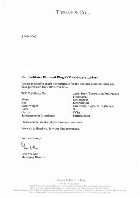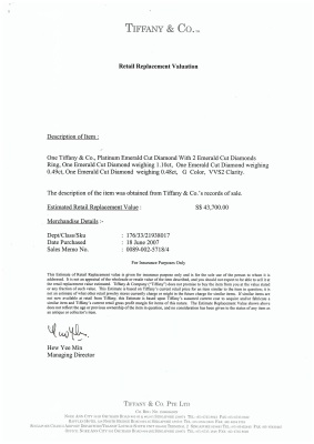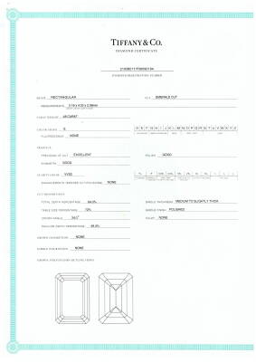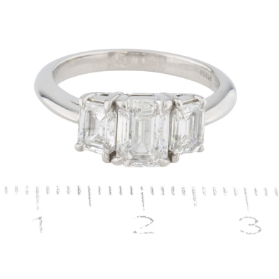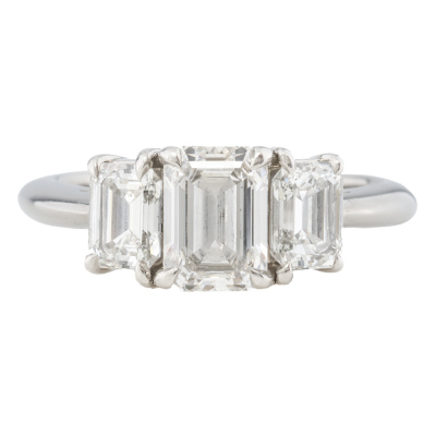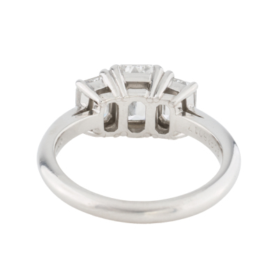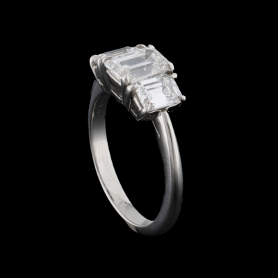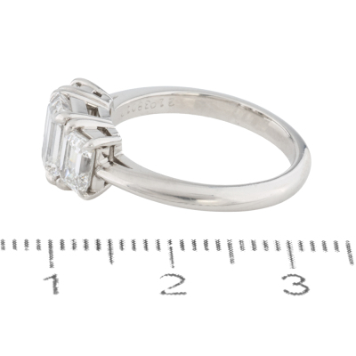 Tiffany & Co. Diamond trilogy ring with a centre emerald cut Natural Diamond of 1.10ct (With Tiffany & Co. Diamond Certificate graded as G VVS2 #F06090194) and two shoulder emerald cut Natural Diamonds totalling 0.97ct (Both with Tiffany & Co. Diamond Certificate's graded as G VVS2 #F06090193, F06090192). Platinum - 950. Ring size K3/4. Band width: 2.3mm-1.8mm. Weight: 6.2g. With Tiffany & Co. Valuation dated 18/06/07 and Box.