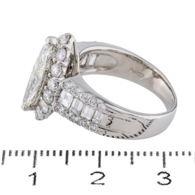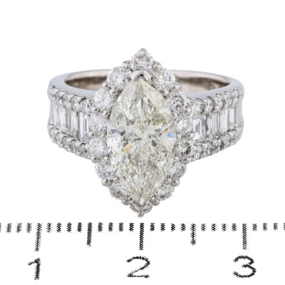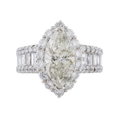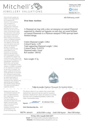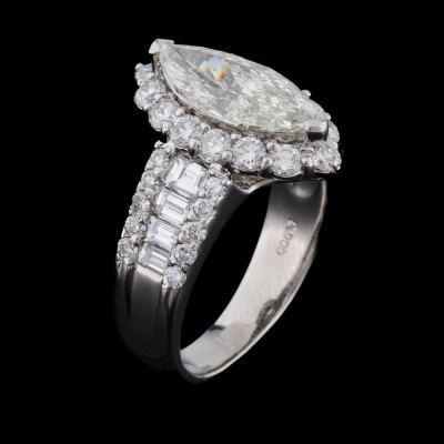 Diamond dress ring with marquise cut Natural Diamond of 2.08ct (Estimated grading: L P2) with round & baguette cut Natural Diamonds totalling 1.64ct (Estimated grading: GH VS). Platinum - 900. Ring size; K1/4 . Band width: 3.4mm - 5.9mm. Weight: 9.7g. With Certificate #422472.