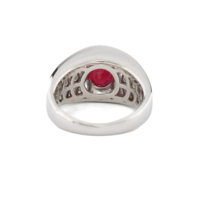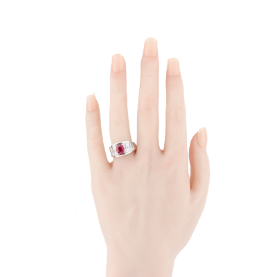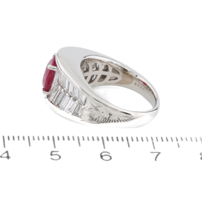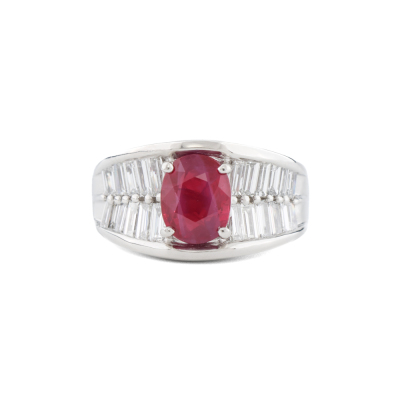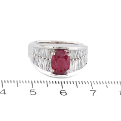 Ruby and Diamond ring with centre oval shape Natural Ruby of 2.08ct and baguette cut Natural Diamonds totalling 1.40ct (Estimated grading: G-H VS). Platinum - 900. Ring size L1/2. Band width: 2.6mm - 5mm. Weight: 12.6g. With Certificate #421774. (Pre-owned)