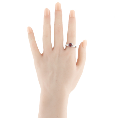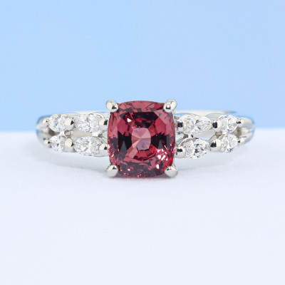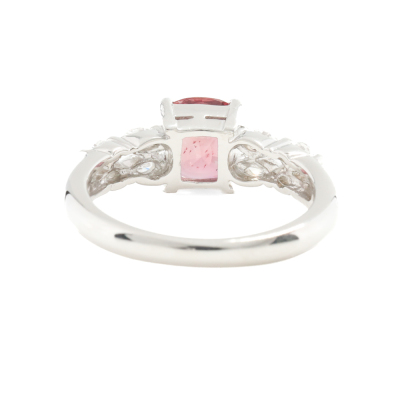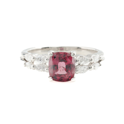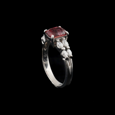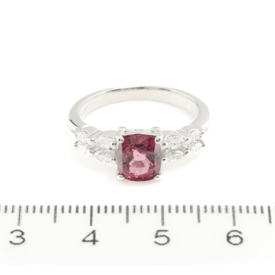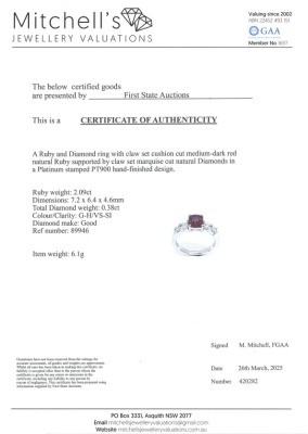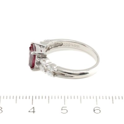 Ruby and Diamond ring with cushion shape Natural Ruby of 2.09ct and pear shape Natural Diamonds totalling 0.38ct (Estimated grading: G-H VS-SI). Platinum - 900. Ring size N. Band width: 3.4mm - 2.3mm. Weight: 6.1g. With Certificate #420282. (Pre-owned)