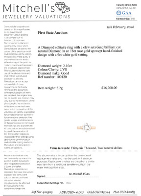 Diamond solitaire ring with centre round brilliant cut Natural Diamond of 2.10ct (Estimated grading: J VS). 18ct rose gold with 9ct white gold setting. Ring size P3/4. Band width: 2.6mm - 3.2mm. Weight: 5.2g. With Valuation Certificate.