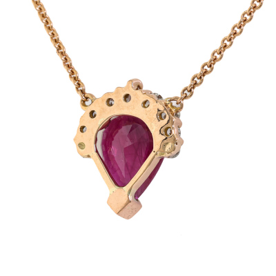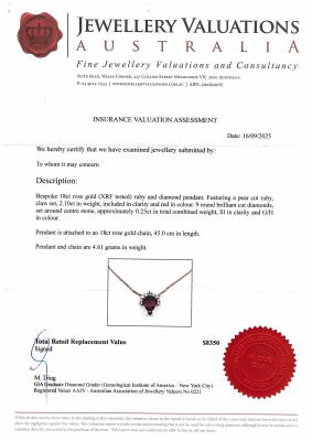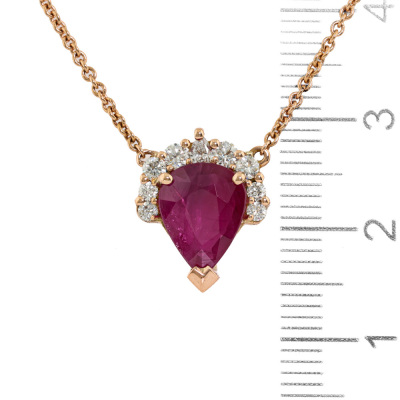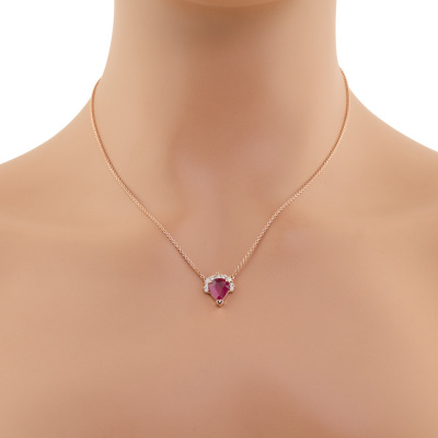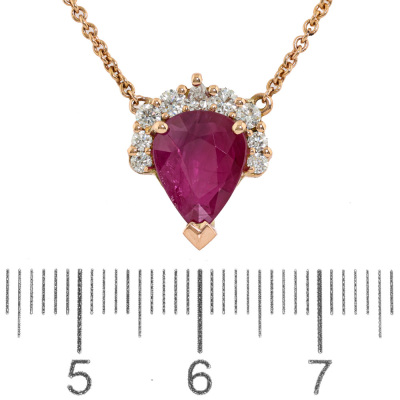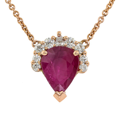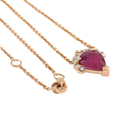 Ruby and Diamond pendant with centre pear shape Natural Ruby of 2.10ct and 9 round Natural Diamonds totalling 0.25ct. 18ct rose gold with 18ct rose gold attached chain. Length: 41cm - 43cm. Weight: 4.4g. With Valuation Certificate dated 16/09/2025.