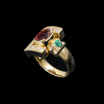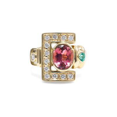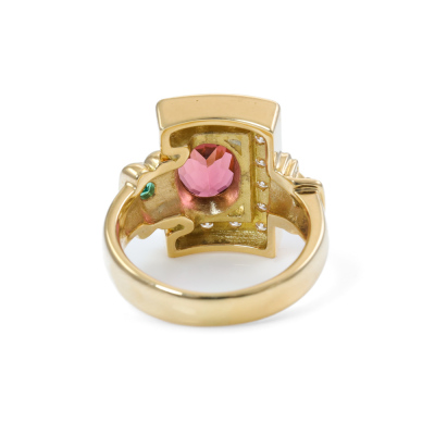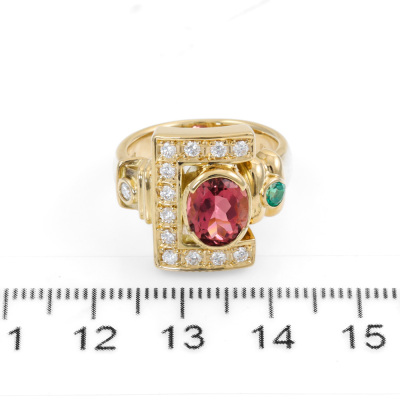 Tourmaline, Emerald and Diamond ring with oval shape Natural Pink Tourmaline of 2.10ct, round Natural Emerald of 0.15ct and round Natural Diamonds totalling 0.32ct (Estimated grading: G-H VS). 18ct yellow gold. Ring size L1/2. Band width: 3.6mm -5.4mm. Weight: 12.0g. (Pre-owned)