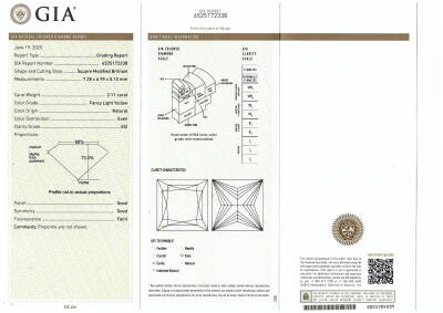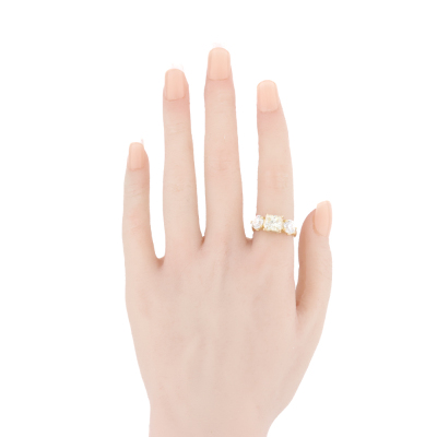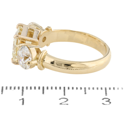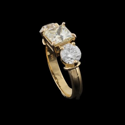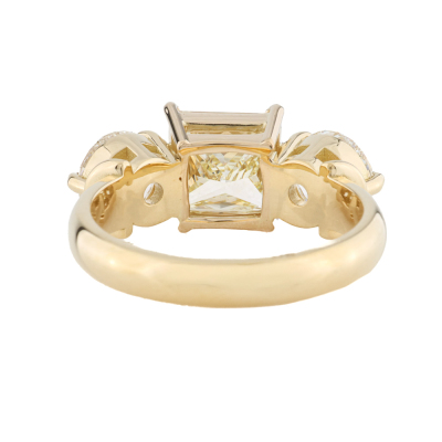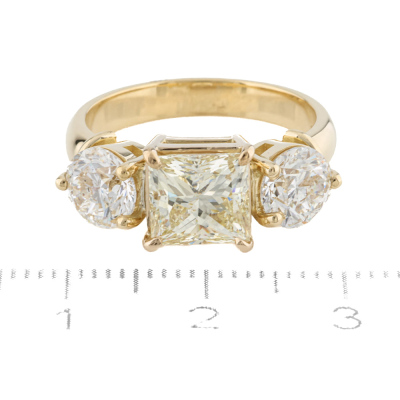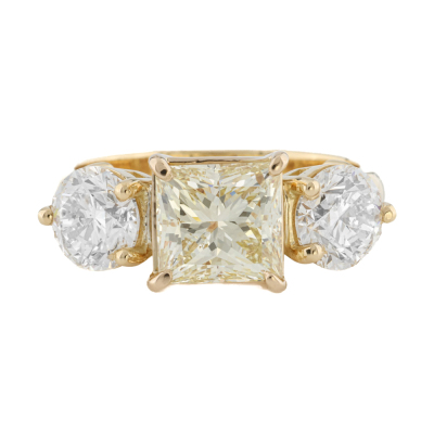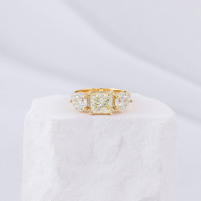 Diamond trilogy ring with 3 Natural Diamonds totalling 4.12ct. With centre princess cut Natural Diamond of 2.11ct (with GIA Report graded as Natural Fancy Light Yellow Even SI2 #6525172338) and round brilliant cut Natural Diamonds totalling 2.01ct (with GIA Reports graded as I SI1 #1232795309, 6532772229. 18ct yellow gold. Ring size M3/4. Band width 3.1mm - 3.4mm. Weight: 7.0g.