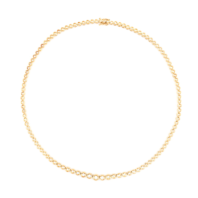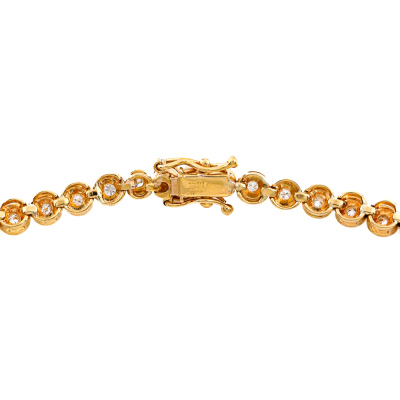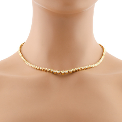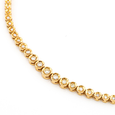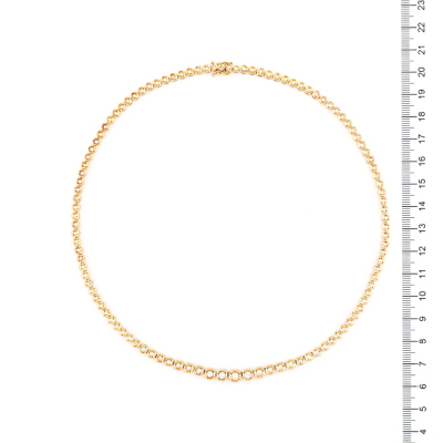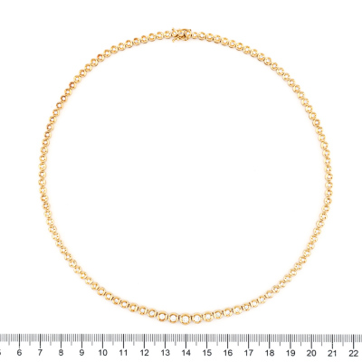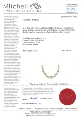 Diamond Tennis necklace with 109 slightly graduated round Natural Diamonds totalling 2.11ct (Estimated grading: H-L VS-SI). 18ct yellow gold. Length: 43.5cm. Weight: 27.1g. With Certificate #421402. (Pre-owned)