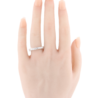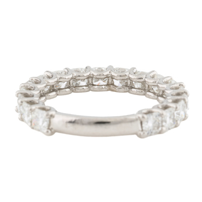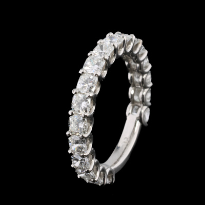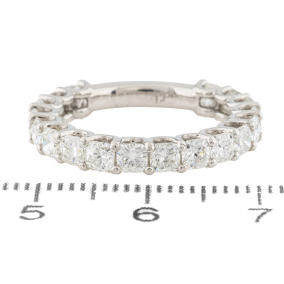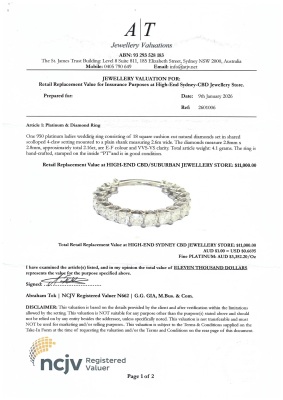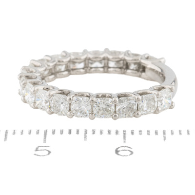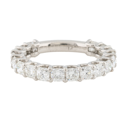 Diamond 3/4 hoop eternity ring with 18 cushion cut Natural Diamonds totalling approximately 2.16ct (with Valuation graded as E-F VVS-VS). Platinum- 950 (XRF tested, stamped 'PT'). Ring size K - ring resizing is not recommended. Band width: 2.6mm. Weight: 4.1g.