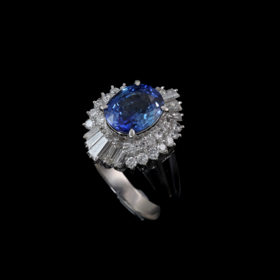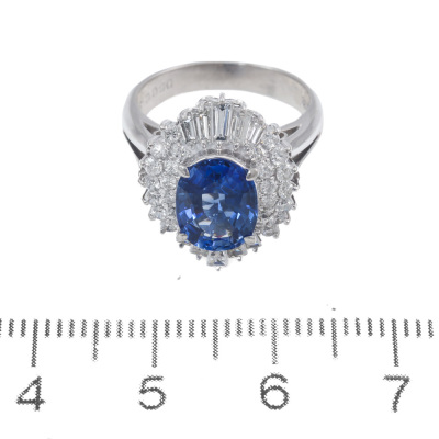 Sapphire and Diamond ring with oval shape Natural Blue Sapphire of 2.18ct and baguette cut & round Natural Diamonds totalling 0.90ct. (Estimated grading: G-H VS-SI). Platinum - 900. Ring size H (Note: small ring size). Band width: 2.8mm - 4mm. Weight: 9.1g. With Certificate #420181. (Pre-owned)