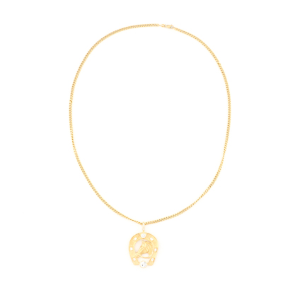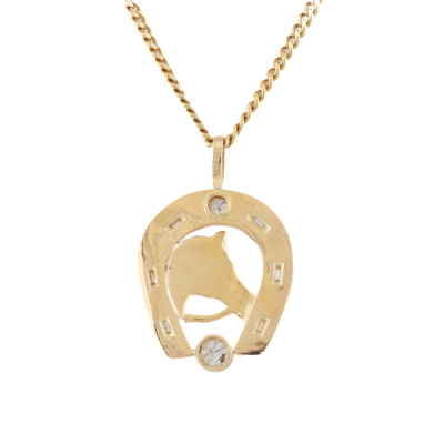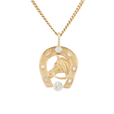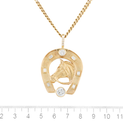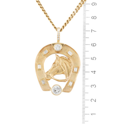 Diamond horseshoe pendant with a round Natural Diamond totalling approximately 1.25ct (Estimated grading: H-I P1), a round Natural Diamond of approximately 0.46ct (Estimated grading: H-I SI) and surrounding round & baguette Natural Diamonds totalling approximately 0.48ct (Estimated grading: H-I VS-SI). 18ct yellow gold with 66cm 18ct yellow gold chain. Width of chain: 3.5mm. Weight: 45.0g. With Valuation Certificate #420871. (Pre-owned)
