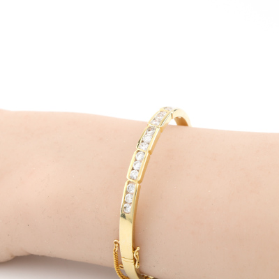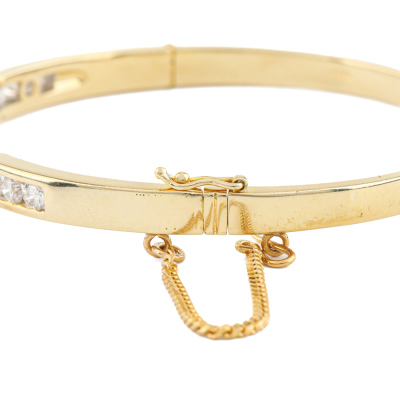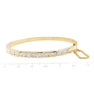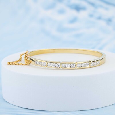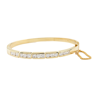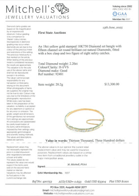 Diamond hinged bangle with 15 round Natural channel set Diamonds totalling 2.20ct (Estimated grading: H-I VS). 18ct yellow gold with safety chain. Inner circumference: 16.0cm. Width: 4.9mm. Weight: 20.2g. With Valuation Certificate #420753. (Pre-owned)