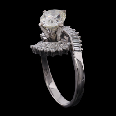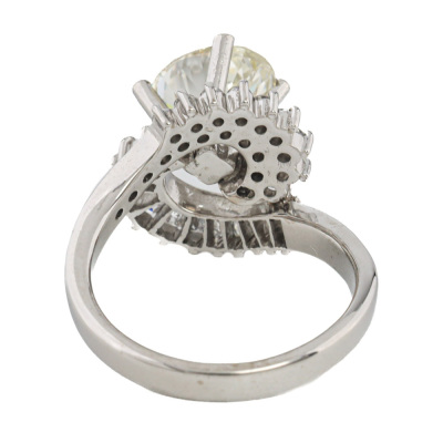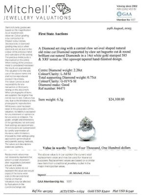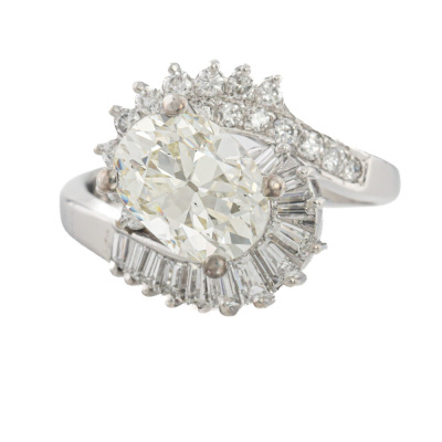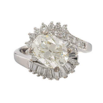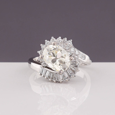 Diamond engagement ring with centre oval shape Old mine cut Natural Diamond of approximately 2.20ct (Estimated grading: L-M SI) and surrounding round & baguette cut Natural Diamonds totalling 0.75ct (Estimated grading: G-H VS-SI). 10ct white gold (XRF tested, stamped 585). Ring size N½. Band width: 2.8mm. Weight: 6.3g. With Valuation Certificate #421325. (Pre-owned)
