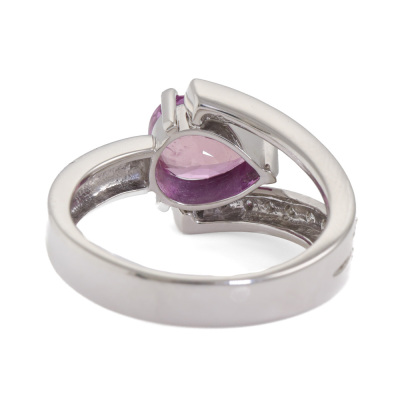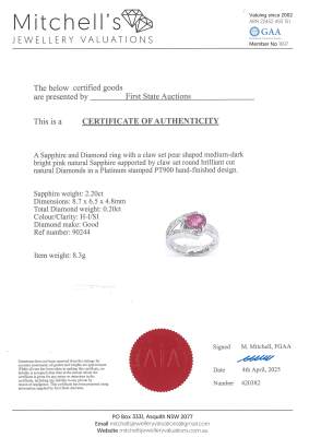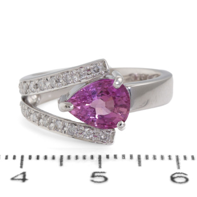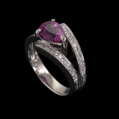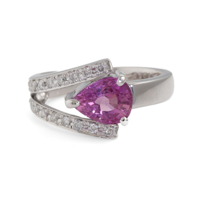 Sapphire and Diamond ring with pear shape Natural Pink Sapphire of 2.20ct and round Natural Diamonds totalling 0.20ct. Platinum - 900. Ring size M. Band width: 3.8mm -4.3mm. Weight: 8.3g. With Certificate #420382. (Pre-owned)