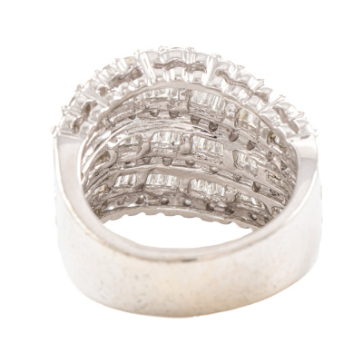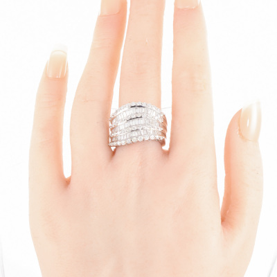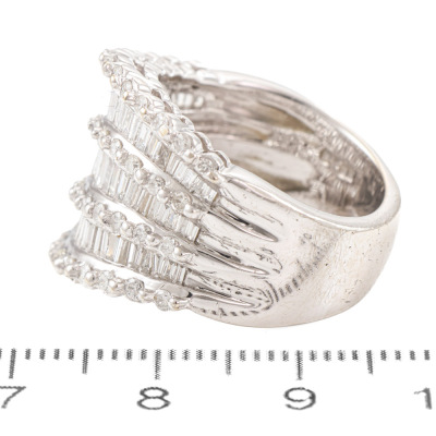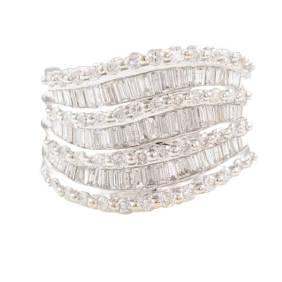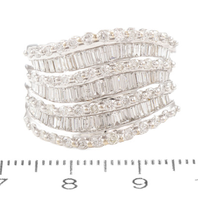 Diamond dress ring with round & baguette cut Natural Diamonds totalling 2.21ct (Estimated grading: GHI SI). 18ct white gold. Ring size: O1/2 -This ring can only be resized up or down by one size. Band width: 6.7mm - 7.7mm. Weight: 16.0g. (Pre-owned)