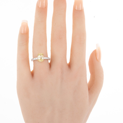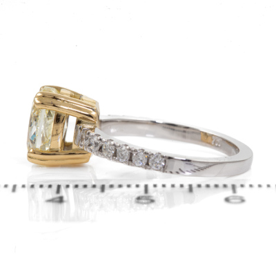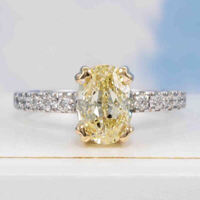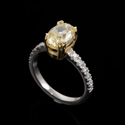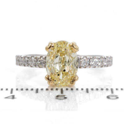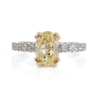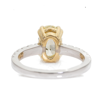 Diamond solitaire ring with centre oval shape Natural Diamond of 2.22ct (with GIA Report graded as Natural Fancy Light Yellow Even P1 #15005761) and surrounding round Natural Diamonds totalling 0.30ct (Estimated grading: G VS). 18ct white and yellow gold. Ring size M. Band Width: 1.9mm. Weight 5.1g. (New)
