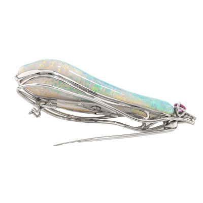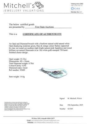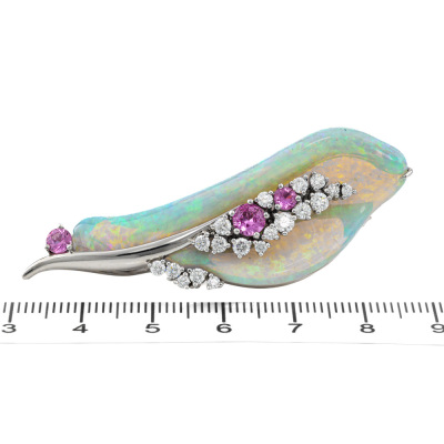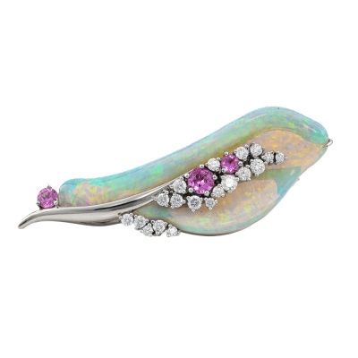Opal and Diamond brooch with freeform solid white Opal of 22.32ct, round Natural Pink Sapphires totalling approximately 0.70ct and round Natural Diamonds totalling 0.82ct (Estimated grading: G SI). 18ct white gold. Weight: 14.6g. With Certificate #421565. (Pre-owned)