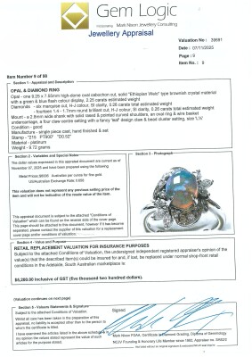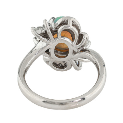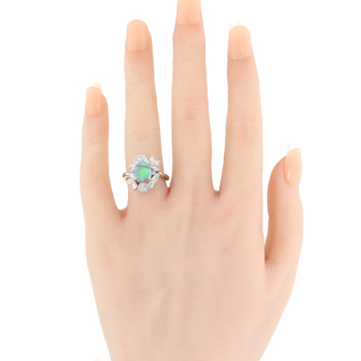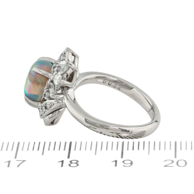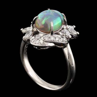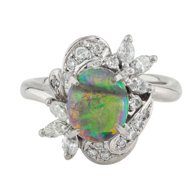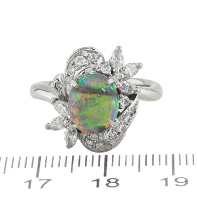 Opal and Diamond ring with centre oval cabochon cut Natural Crystal Opal of approximately 2.25ct and round & baguette cut Natural Diamonds totalling 0.52ct (Estimated grading: H-J SI). Platinum - 900. Ring size L. Band width: 2.8mm - 2.5mm. Weight: 9.7g. With Valuation Certificate dated 07/11/2025. (Pre-owned)